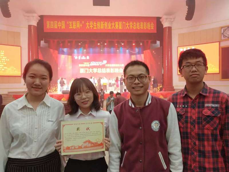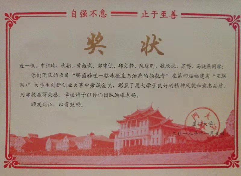 2018年11月13日晚第四届中国“互联网+”大学生创新创业大赛厦门大学总结表彰晚会在建南大会堂举行,回顾大赛筹办工作历程,总结工作经验,表彰先进。厦门大学医学院微生态研究院任建林教授团队连一帆、陈琼昀博士的 “肠菌移植-国内临床微生态治疗的领航者”项目获得福建省主赛道创意组金奖并得到了厦门大学的通报表扬。