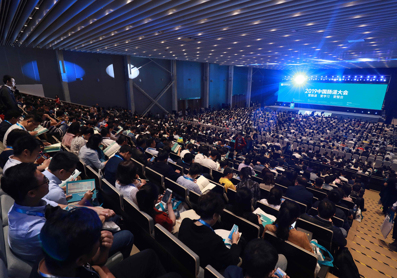 6 个会议厅同时进行不同会议主题,三天会期,内容满,观众满,看点多。5 月 4 日早上 8 点,开幕式大厅近 2000 个座位就已经坐满,通道甚至后面的台阶上都坐满了人,同时三个玻璃会议厅的开幕式直播现场也全部满员。仅参加开幕式主会场和直播会场的观众就有3000 多人,堪称中国乃至世界最大的以肠道为主题的学术和产业大会。专家们齐聚一堂,用一场场精彩的主题演讲,给参会人员带来了高质量的头脑风暴。