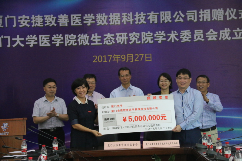 9月27日,厦门安捷致善医学数据科技有限公司捐赠仪式暨厦门大学医学院微生态研究院学术委员会成立大会在厦门大学召开。会上宣布,厦门大学医学院微生态研究院学术委员会正式成立。同时,厦门安捷致善医学数据科技有限公司向该研究院捐赠500万元,将用于资助微生态研究院的建设发展。